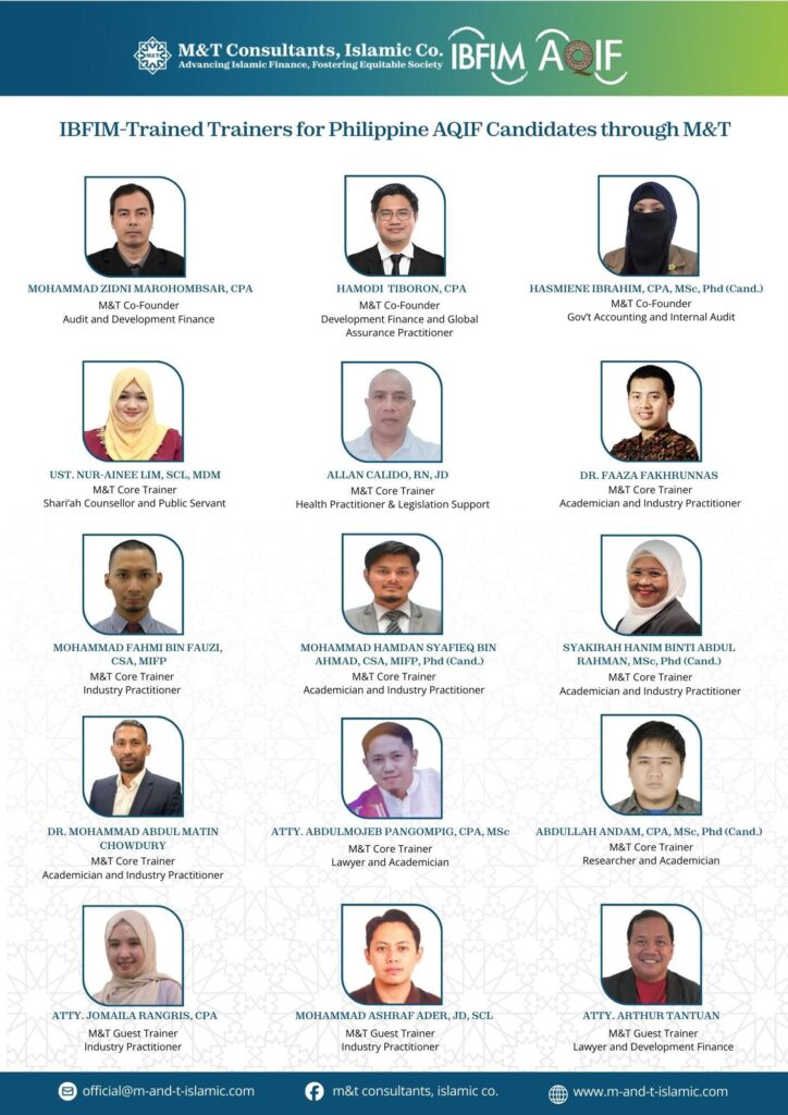 We are proud to introduce the professionals who, after successfully completing the full Associate Qualification in Islamic Finance (AQIF) course and passing its assessment, were further trained by the Islamic Banking and Finance Institute Malaysia (IBFIM) to become M&T’s certified trainers for AQIF candidates in the Philippines.